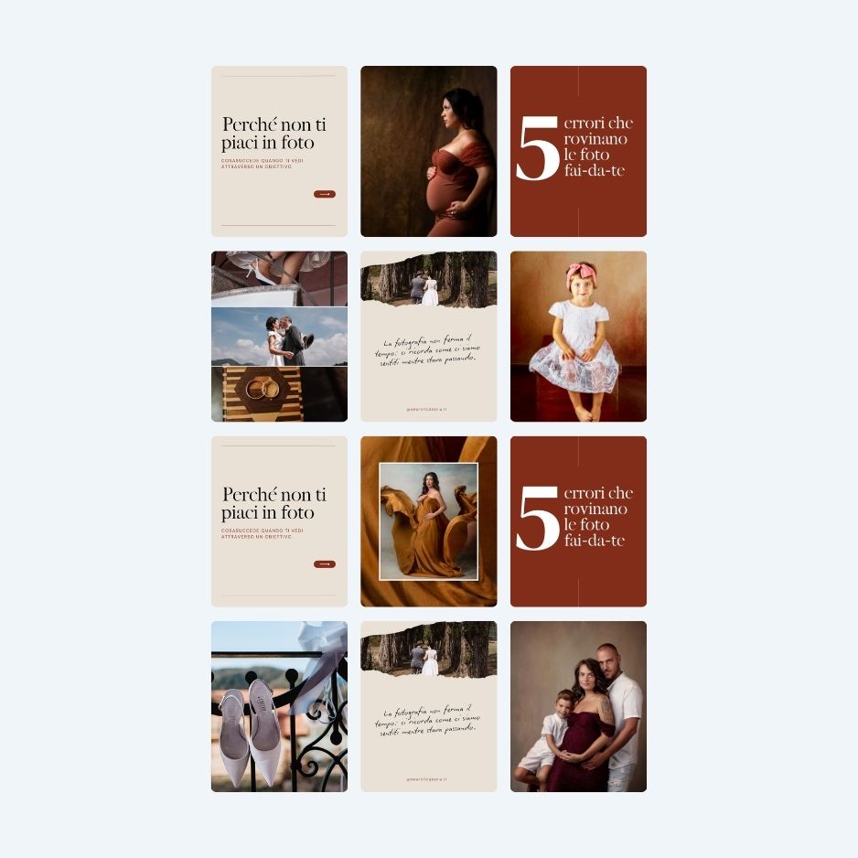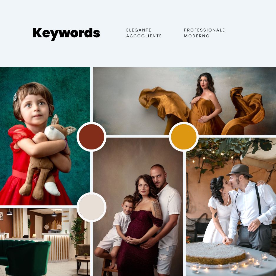 La palette cromatica, calda e avvolgente, contribuisce a creare un’identità visiva equilibrata tra eleganza contemporanea e dimensione emotiva, lasciando sempre spazio centrale alle immagini fotografiche.