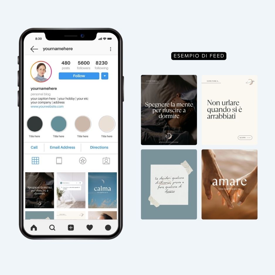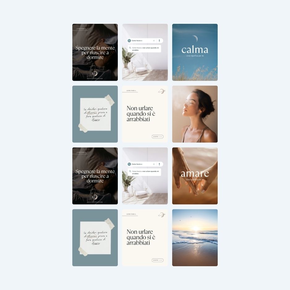 Il feed mantiene lo stesso linguaggio visivo del sito: colori morbidi, tipografia pulita e contenuti pensati per divulgare temi legati al benessere psicologico, mantenendo sempre un tono rassicurante e accessibile.