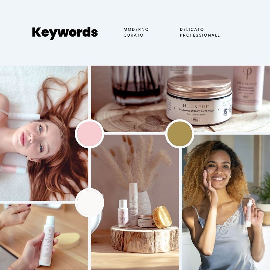 Ho lavorato sulla palette di brand già esistente, molto soft e luminosa (rosa cipria, oro desaturato e bianco caldo) per trasmettere: