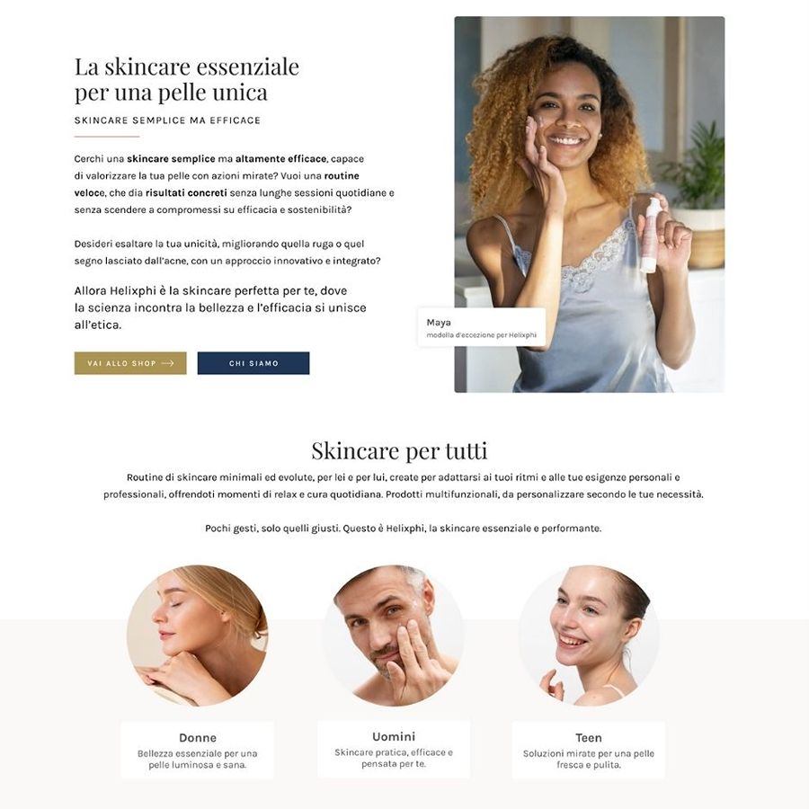 Il layout accompagna l’utente in modo semplice e intuitivo: hero esplicativo con un messaggio chiaro su benefici e filosofia del brand, delle sezioni dedicate alle linee prodotto (donna, uomo, teen, specialist) e focus sui valori: cruelty free, dermatologicamente testati, made in Italy.